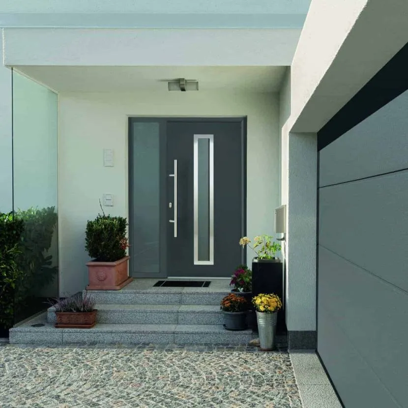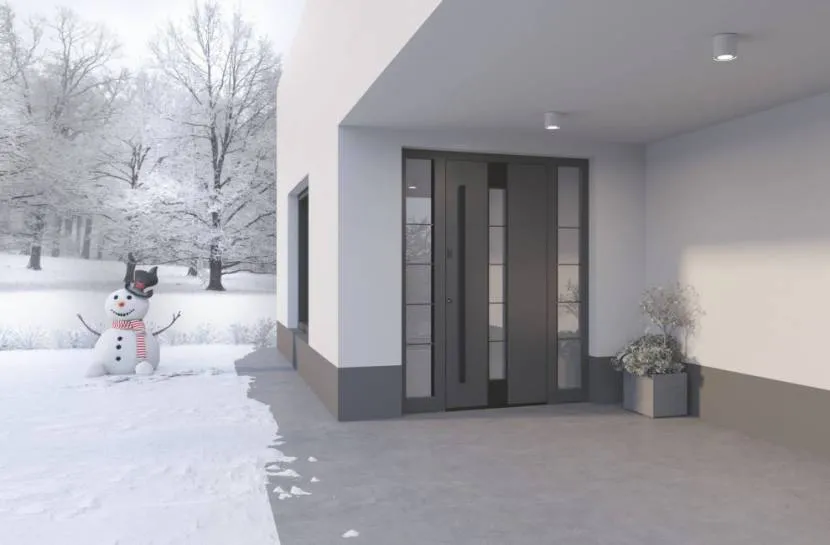 - Алюминиевые входные двери считаются самым дорогим продуктом на рынке. Они производятся на раме из алюминиевых профилей, а сверху покрываются листами ПВХ или стеклопластика. Однако, из-за свойств алюминия, их трудно назвать теплыми, обычная алюминиевая дверь имеет коэффициент теплопередачи U=1,3-1,4 Вт / (м 2 К). Однако совсем другое дело — алюминиевые двери с теплоразрывом, такие изделия имеют отличные параметры теплоизоляции. Лучшие из них имеют коэффициент U на пассивном уровне — 0,47 Вт / (м 2 К). К тому же алюминиевые входные двери можно сделать большого размера. Их можно объединить в наборы и создать эффектную стеклянную входную зону.
