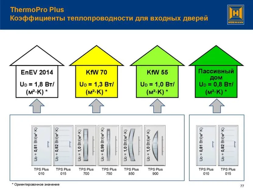Важно уточнять коэффициенты по параметрам конкретной модели двери (ее размера и типа). Дело в том, что теплоизоляция – переменчивый параметр, и будет разной у конструкций разной ширины или высоты, со стеклом или без; даже если вставить глазок, это приведет к изменению уровня теплоизоляции