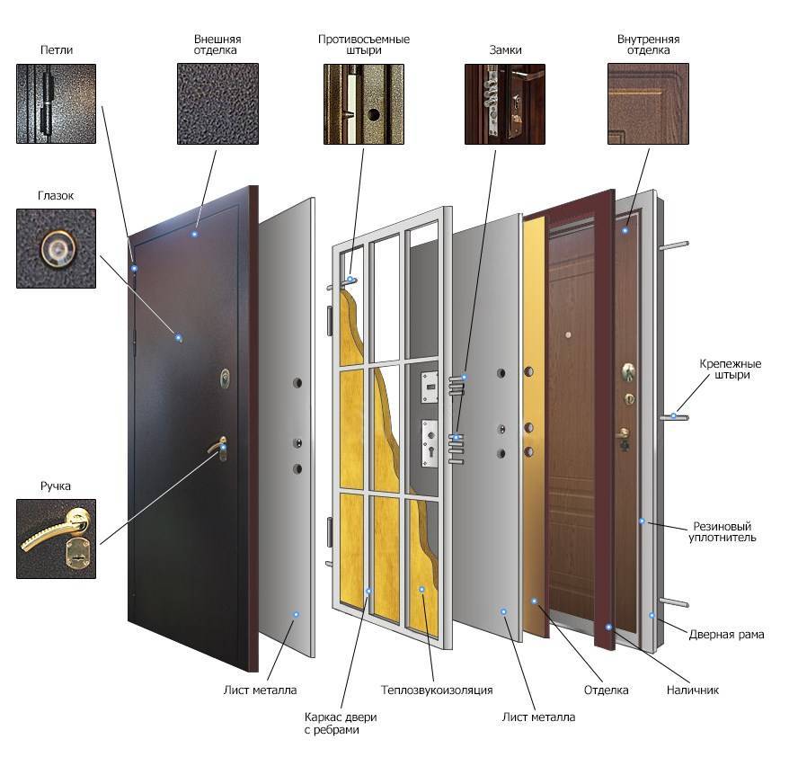 Входные металлические двери изготавливаются из холоднокатанной стали разной толщины, а их конструкция состоит из следующих элементов: