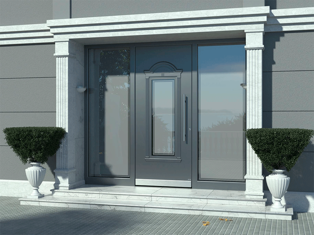 Входная металлопластиковая дверь глухого типа – самая популярная модель, но гораздо интереснее смотрятся изделия со стеклом. Такой дизайн выглядит богато, стильно, но закаленный прозрачный элемент не снижает показателей безопасности.