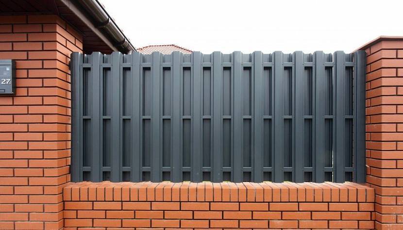 Комбинированный забор из кирпича и металлического штакетникаИсточник zaborstroi.com