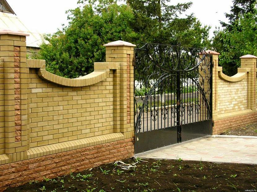Кирпичная модель – это прочный и хороший вариант. Он будет прекрасно гармонировать как с каменными, так и металлическими опорными столбами. Прослужит не одно столетие. За ним не нужно ухаживать.