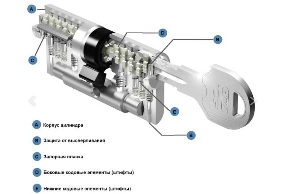 Секретный механизм замка состоит из цилиндра, который может провернуться на открытие только в случае, когда штатный ключ отожмет все подпружиненные штифты, мешающий повороту цилиндра.