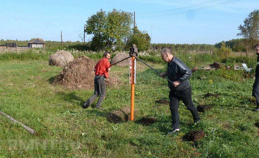 - Если конструкция не поддается ввинчиванию и разрыхляет грунт, ее нагружают. Для этого или два человека повисают на рычагах, или один усаживается сверху. Когда вкручиваемый элемент уперся в твердый предмет, и дальше невозможно его продвинуть, оставляют ее так как есть, излишек по длине обрезают.