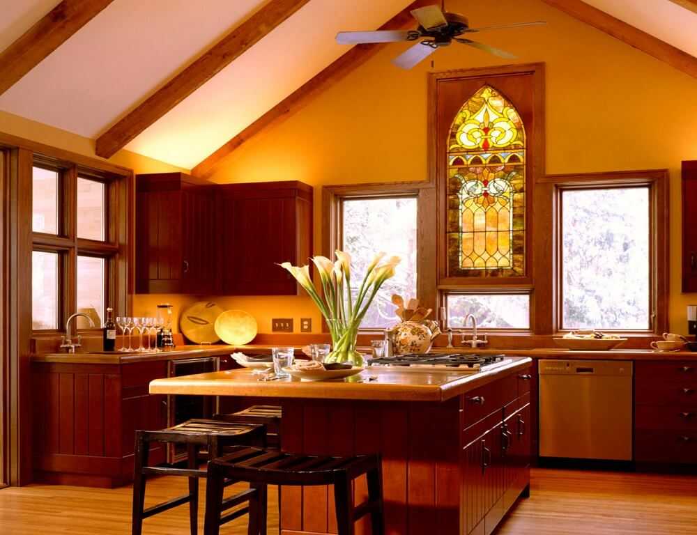 Можно использовать витражи и на кухне: это, как уже было сказано, витражные вставки в кухонных фасадах, витражная люстра или бра, потолочная конструкция с псевдовитражом (например, над рабочей зоной или над островом).
