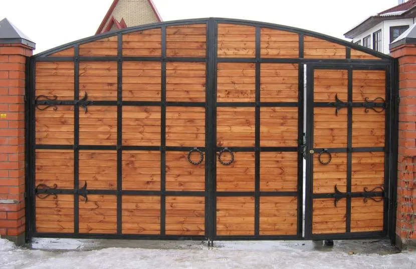 Для заполнения рам используют рейки, штакетины, фанеру, металлоконструкции, кованные элементы и другие материалы. Интересный вариант отделки деревянной калитки — «елочка». Поперечные перекладины крепят под углом к фигурным вертикальным брусьям.