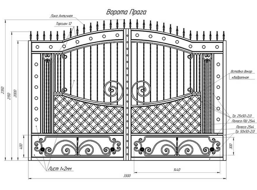 Когда вы поняли, что вам по душе, что сочетается с вашим уже стоящим или проектируемым забором, самое время сделать кованые ворота, выяснить размеры для выполнения или заказа чертежа. Первоначально набросайте несколько вариантов: вы сможете выбрать из них наиболее впечатляющий и удачный. Точно определите основные геометрические параметры, рассчитайте количество составных частей.