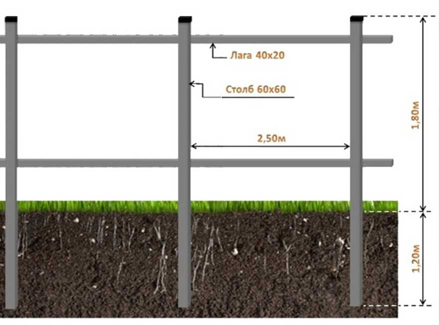 Прожилины ‒ несущие элементы забора. В готовом виде это брус сечением 50*80 мм. Подойдут и поперечные планки длиной от 2 до 2,5 метров, сечением 40 см.