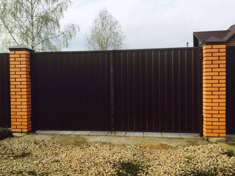Первый и один из самых трудоемких этапов работы — это монтаж опорных столбов, на которых будет держаться калитка из металлопрофиля, своими руками. Сделать это несложно, но времени займет достаточно много, особенно если речь идет о кладке из кирпича.