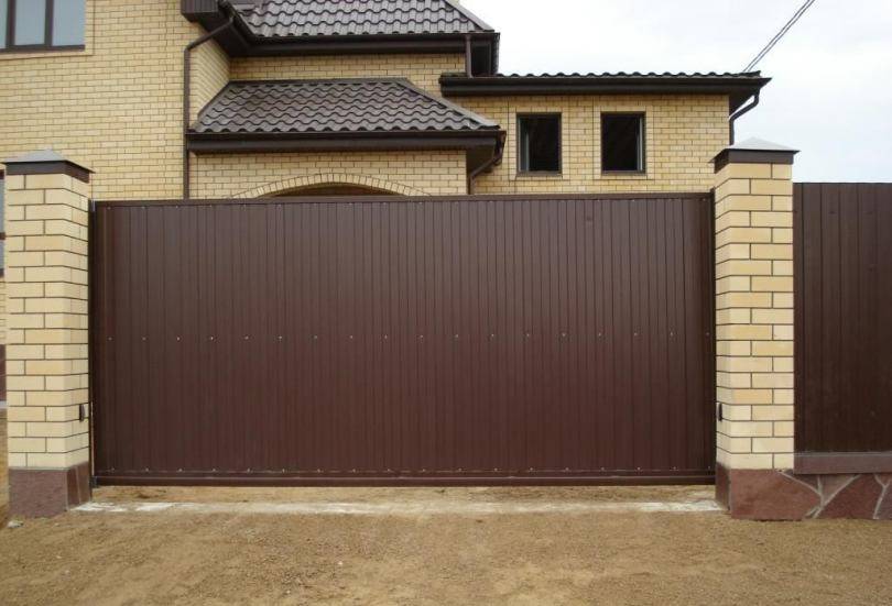 Использование профилированного листа для изготовления входной группы получило такое распространение, так как сделать калитку и ворота из профнастила очень просто и недорого. Поэтому в подавляющем большинстве случаев в качестве опор применяются именно металлические трубы. Установить их гораздо проще, дешевле и быстрее, чем кирпичные.