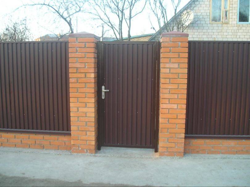 Существует два варианта устройства забора из профилированного листа. Первый и наиболее простой — это вариант крепления ограждения к вкопанным в землю столбам из металлических труб. Во втором варианте забор с воротами и калиткой из профнастила крепятся к столбам из кирпича или камня.