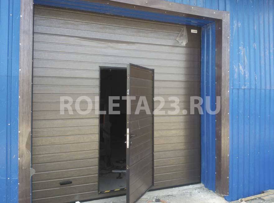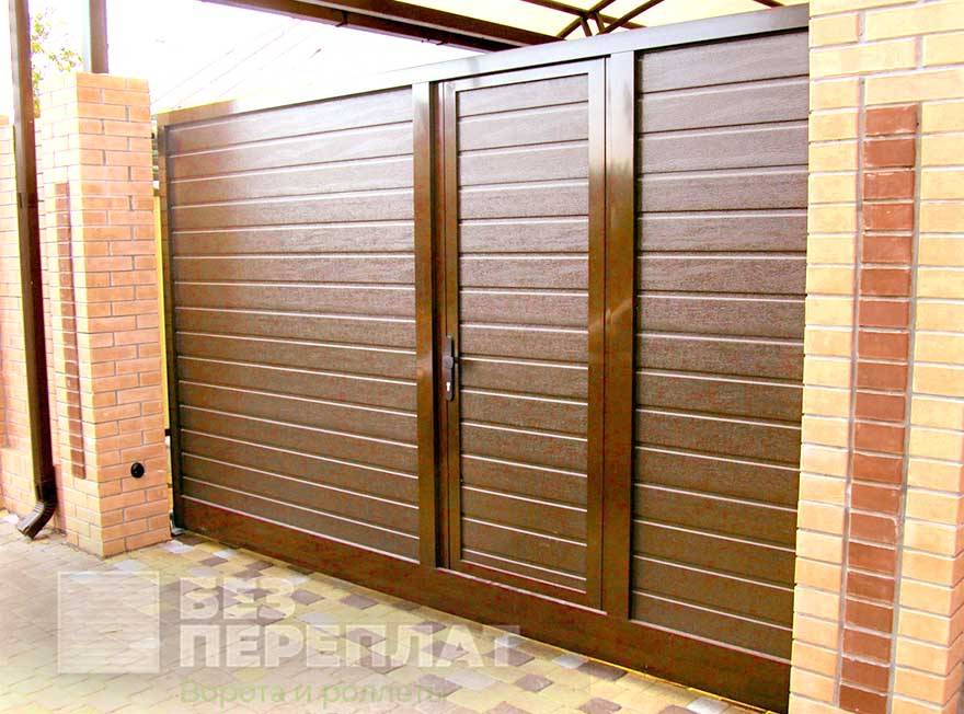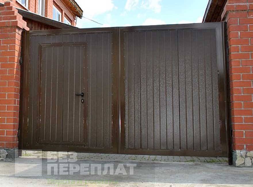 Стильные коричневые металлические глухие ворота с калиткой Источник донская-крепость.рф
