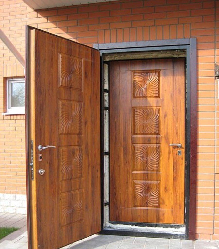 Двойная конструкция зависит от величины дверного проема. Квартиры оборудуются одностворчатыми распашными дверями. Частные дома имеют большие нестандартные проемы, в которые удобно устанавливать двустворчатые изделия. Створки двери могут быть одинаковыми или иметь разные размеры. При этом большая — подвижная и оборудуется замком, а вторая неподвижно закрепляется специальными запорами и открывается в случае крайней необходимости.