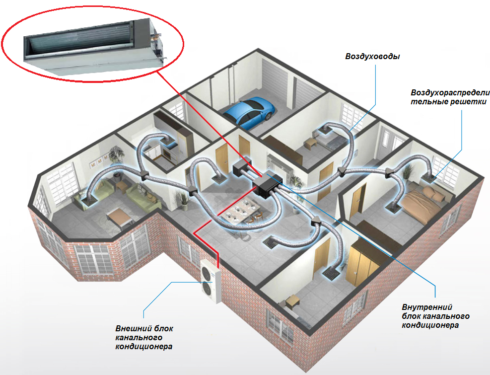 Кондиционер канального типа включает в себя больше количество устройств, тесно взаимосвязанных друг с другом.