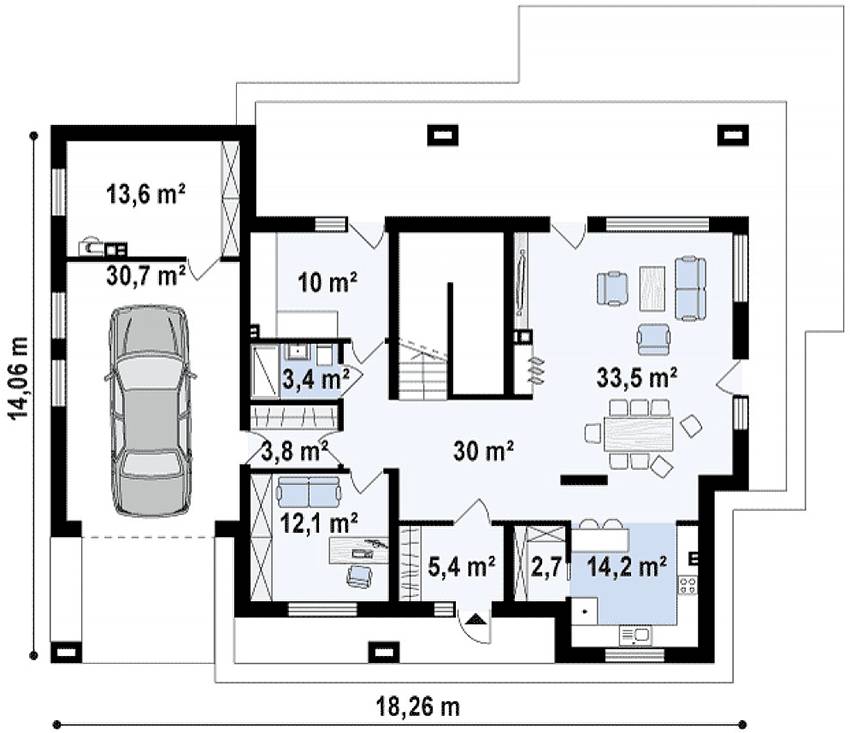 Одноэтажные дома с гаражом представляют собой удобный вариант при небольшом количестве проживающих. Преимущества таких зданий неоспоримы: