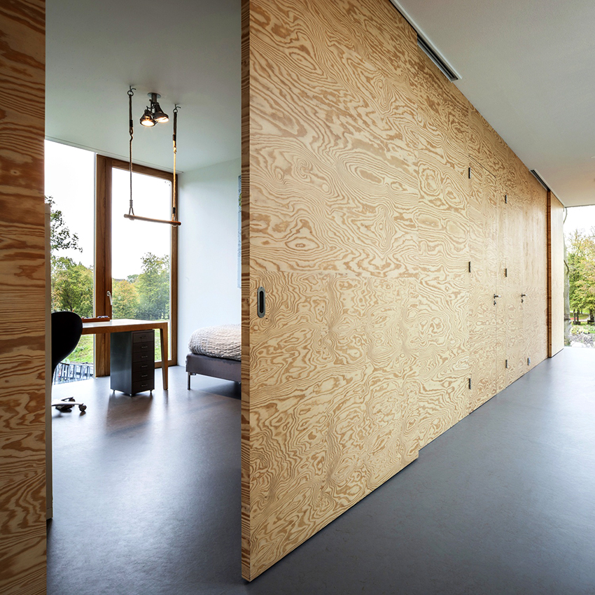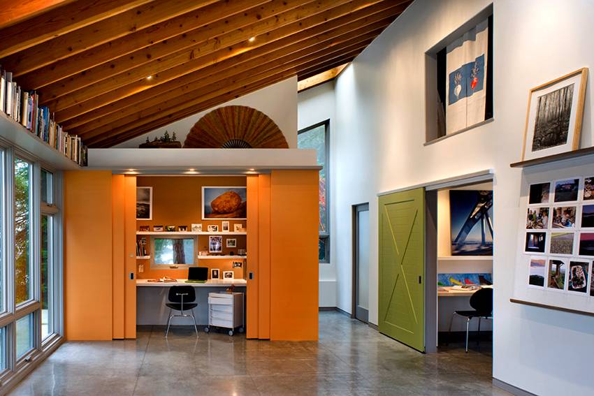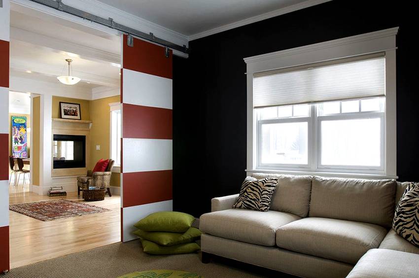 Также при помощи этих раздвижных конструкций можно разбить помещение на зоны. Хотя в этом случае двери скорее исполняют роль перегородки в закрытом состоянии, а открытое положение соответственно объединяет все помещение. В таком варианте чаще всего направляющие крепятся к потолку.