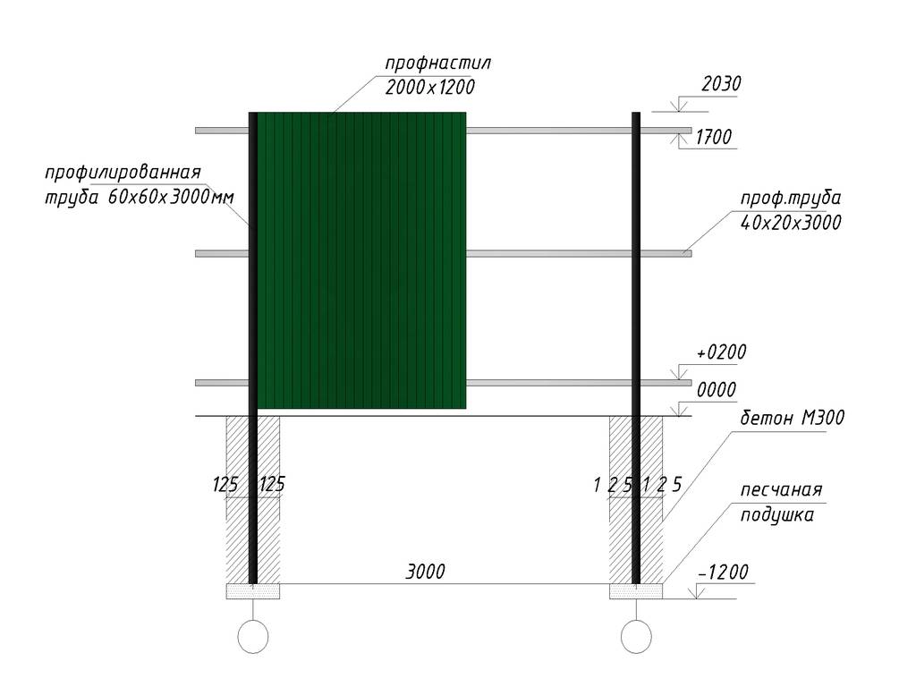 - Стальные столбы из профилированной трубы размерами 100х100 и высотой 4 метра в бетонном основании