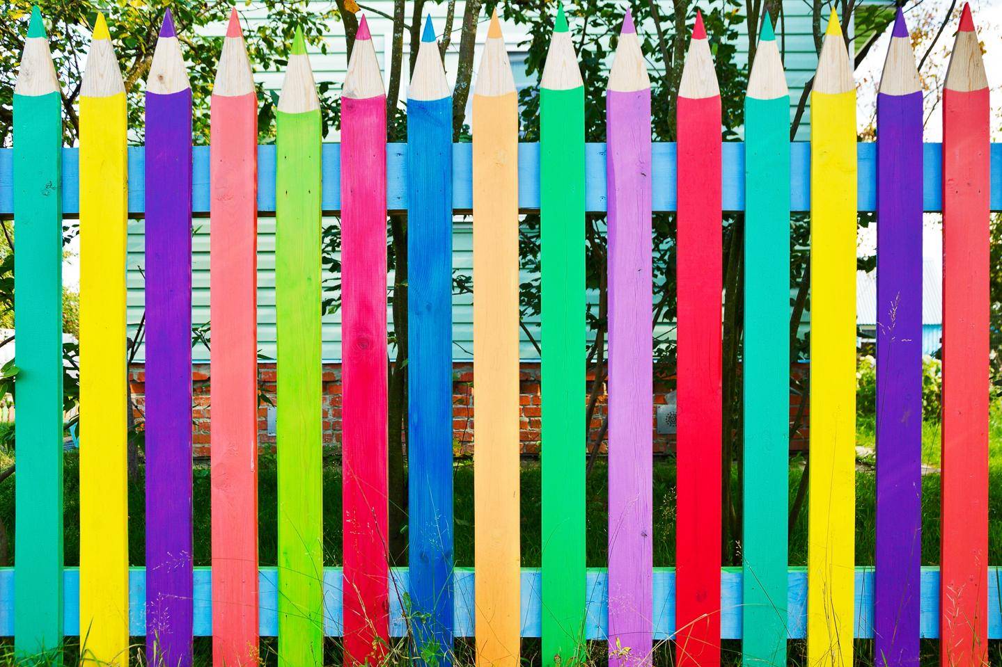Если есть желание придать забору необычный вид, окрасьте штакетины в разные яркие цвета — тогда он станет похож на частокол из цветных карандашей.
