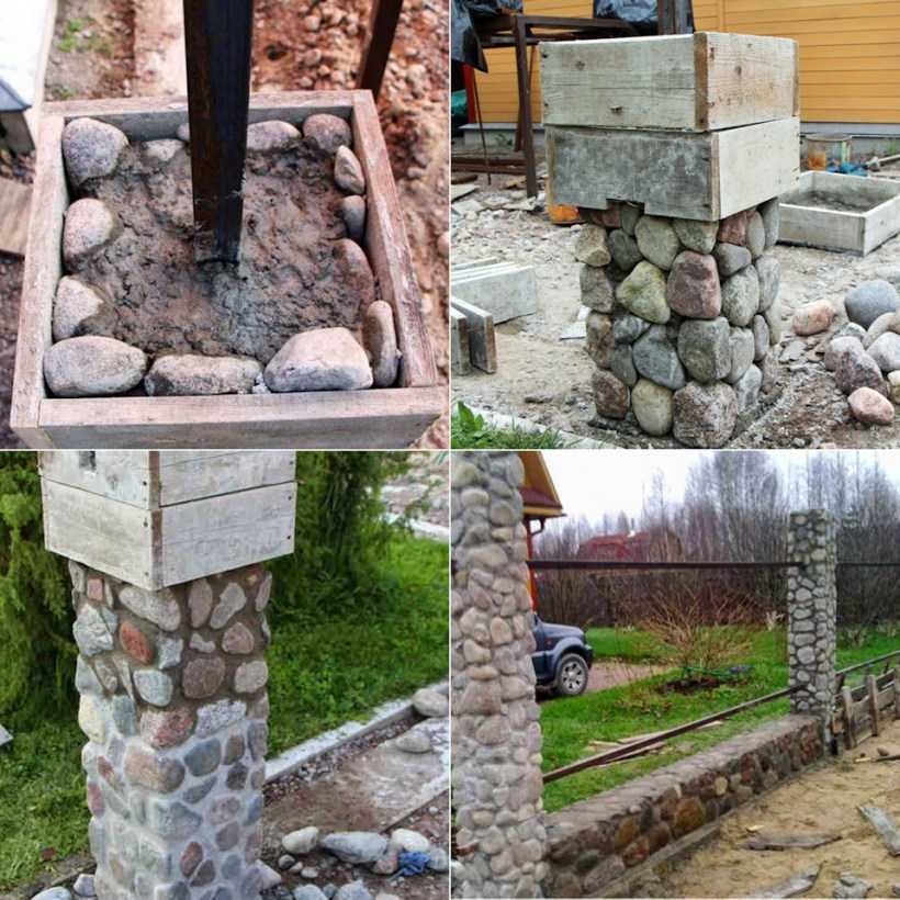 Столбы устраиваются сечением от 300х300 мм и до 450х450 мм. Зависит от толщины самого пролёта забора и его высоты. Оптимальной считается высота забора из камня около 2500 мм. Короба изготавливаются из обрезной доски нужного для столбов сечения, они устраиваются по методу скользящей опалубки. Выставляется опалубка на основании фундамента. Затем без раствора предварительно раскладывается один ряд камней, грани бута должны плотно прикасаться к доскам опалубки.