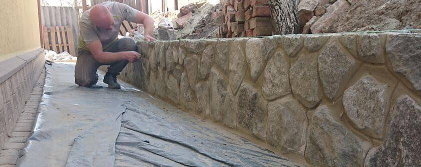 Вторым шагом является уже укладка бута на густом цементном растворе. В таком виде кладку оставляют на 1–2 дня. Далее опалубка приподнимается, и аналогично выкладываются остальные ряда камня до проектной высоты. После снятия опалубки швы между камнями обрабатываются и затираются цементным раствором, после можно выполнить расшивку швов.