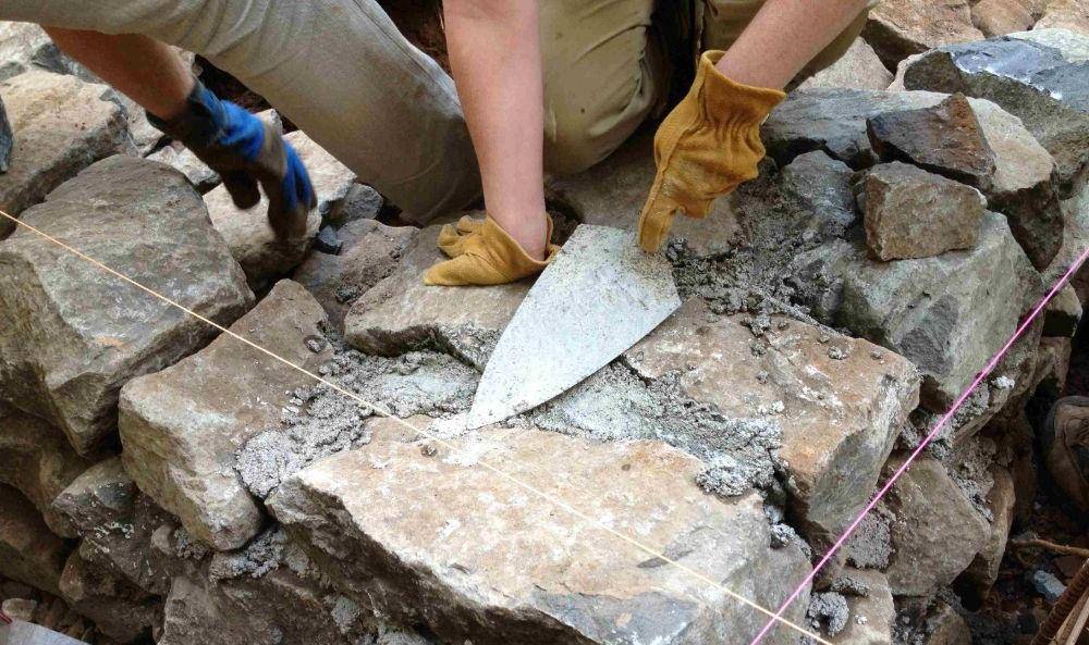 Готовьтесь к тому, что в процессе строительства потребуется много раствора. Он нужен не только для сооружения фундамента из бутового камня, но и непосредственно для кладки камней самого забора.