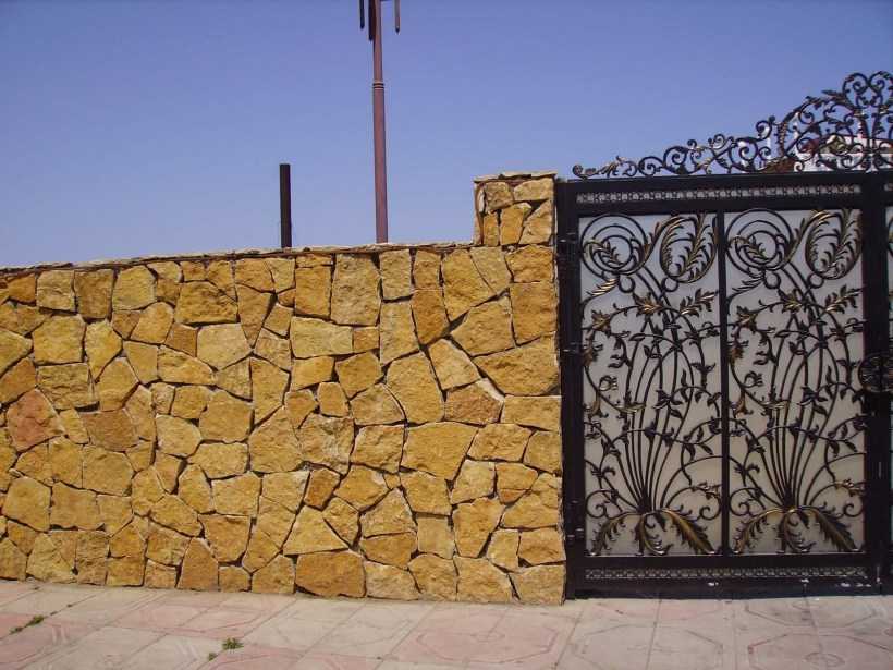 - Сочетаемость с другими элементами. Нередко при строительстве каменного забора используются металлические или деревянные фрагменты, а также дополнительные кованые украшения.