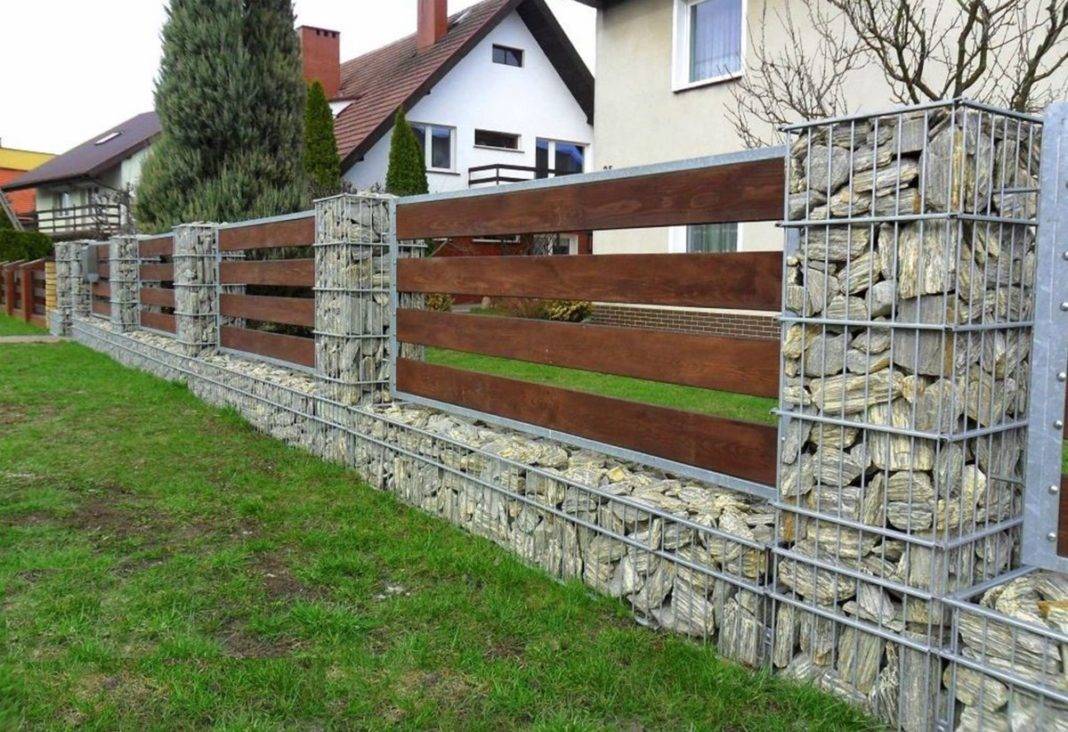 - Комбинированные . Часто используются для загородных оград. Сетку, наполненную камнями, успешно сочетают с секциями из дерева, кирпича, металла. При этом габион служит цоколем или опорным столбом.