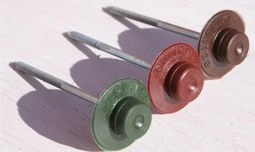 Возникает вопрос чем крепить ондулин. Обычные гвозди или кровельные с оцинкованными шляпками, не пойдут. Нужно использовать специальные саморезы с пластиковыми шляпками, предохраняющими крепёж от коррозии. Шляпки у них широкие для надёжного прижатия листов. Если шляпка будет маленькая, то ондулин легко сорвёт ветер.