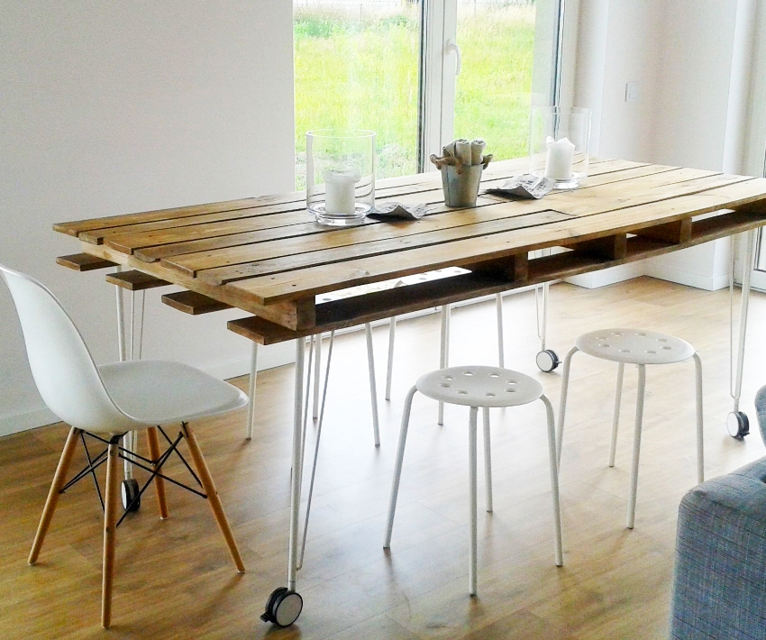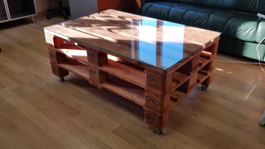 Низкий столик можно создать из двух поддонов, положенных один на другой. Для создания передвижного и практичного стола можно прикрутить колесики под его основанием и укрыть верх листом фанеры или стекла.