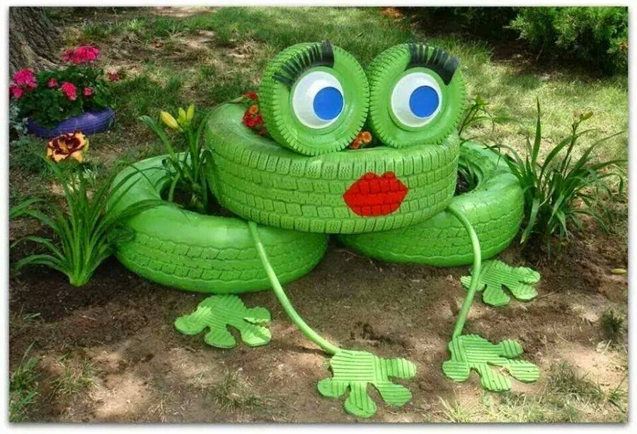Примечательную и забавную жабку легко собрать из цельных шин: