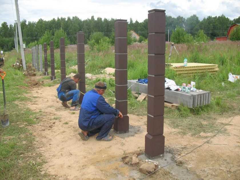 3. Заливка фундамента и установка столбов. Порядок выполнения работ зависит от выбранного типа основания. Он может быть ленточным и локальным. В первом случае вдоль всего ограждения выкапывается траншея для заливки фундамента, на который будут опираться стойки. Во втором случае устанавливаются только столбы. Для этого в местах их размещения предусматриваются ямы для последующей заливки бетона. После установки столба в центр метровой ямы, обложенной рубероидом, производится заливка бетонного раствора;