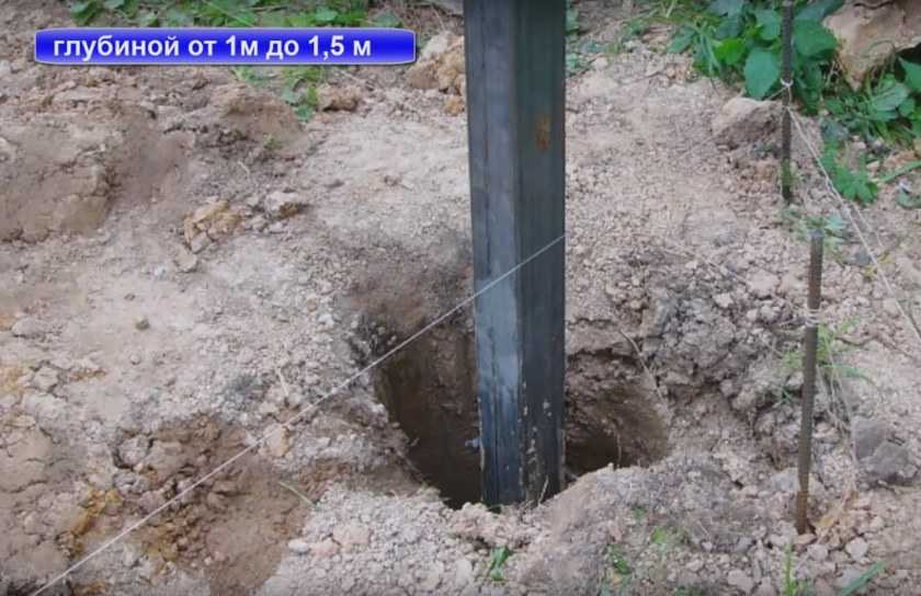 На гравийную подушку в яму устанавливают столбы и крепят строго вертикально и в плоскости забора при помощи распорок и растяжек. Длина столба равна высоте столба + длина заглубляемой части (глубина промерзания + 200 мм).
