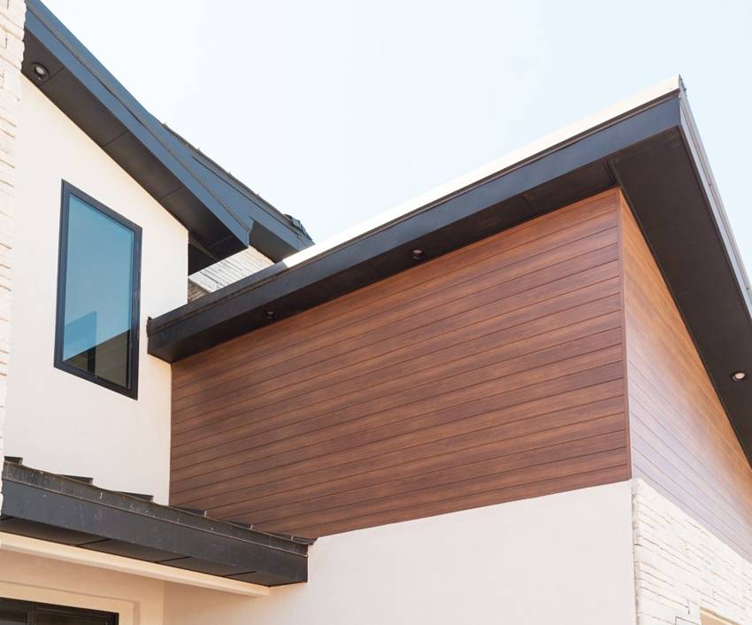 Деревянный сайдинг. Панели для него изготавливают термическим прессованием, добавляя в состав сырья сберегающие смолы. Сформированное изделие покрывают многослойной пленкой из краски и лаков, которая придает готовым панелям долговечность и водоотталкивающие свойства.
