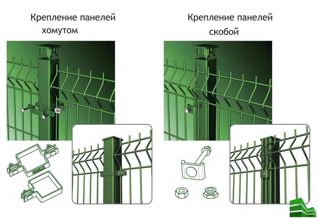- Внедрение секций. Металлические 3Д панели навешиваются на столбы и закрепляются скобами и хомутами П-формата или прижимистыми пластинками.