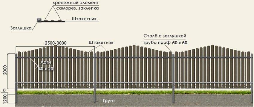Универсальная схема монтажа забора из металлического или деревянного штакетника.