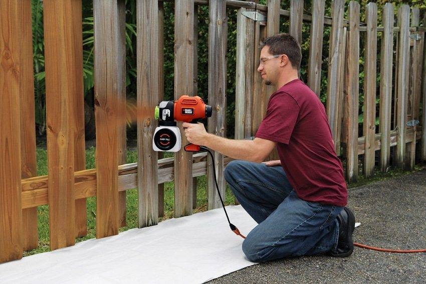Равномерно и быстро покрасить деревянный забор можно с помощью пульверизатора.Полезный совет! Устанавливая на даче деревянные заборы, будьте готовы, что периодически их необходимо обрабатывать краской и производить замену подгнивших элементов на новые.
