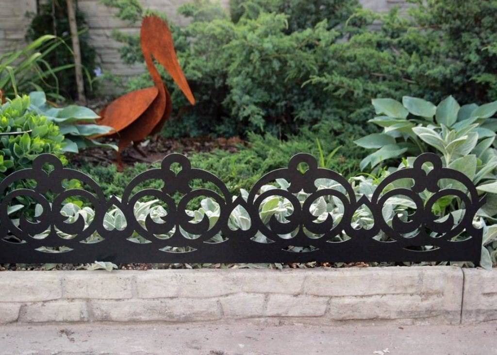 Стальные ограды лишены недостатков деревянных. Популярность металлических элементов в дизайне садовых участков во многом объясняется удивительным сочетанием легкости и надежности. Цветники огораживают сварными, коваными и литыми конструкциями. Последние делают из чугуна, они много весят и выглядят массивно. Их редко применяют при оформлении цветника на даче своими руками. Сварные заборы выглядят строго: пересечение прямых линий не оставляет места для ажурных завитков, в отличие от кованных моделей.