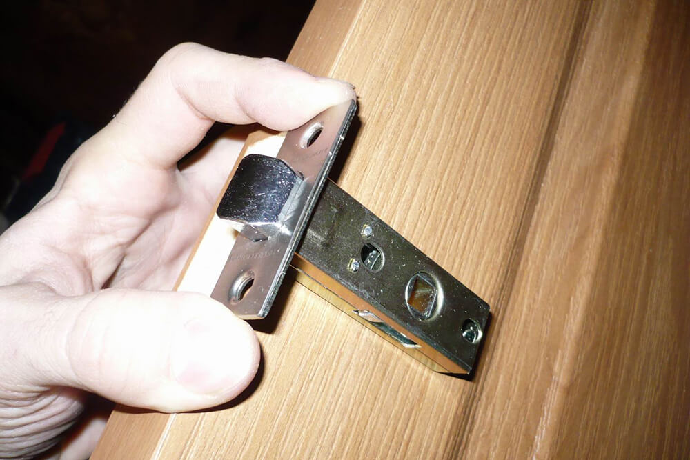 В полученное таким образом отверстие вставляется защелка. Для выборки места под монтаж планки предварительно накладывается на торец сама деталь и обводится карандашом. В случае работы со шпонированной дверью необходимо аккуратно прорезать необходимый по форме слой покрытия. Для того, чтобы врезать замок в межкомнатную дверь, используется столярный нож. После выборки защелка закрепляется при помощи саморезов.