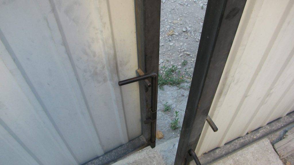 Многие народные умельцы используют готовые варианты такого устройства, оставшиеся после демонтажа грузовых автомобилей. Также можно для этих целей воспользоваться отрезком стального прута, который сгибается и фиксируется петлями на створки ворот. Чтобы щеколда плотно удерживала створки в закрытом положении, в раме просверливаются отверстия, куда будет входить прут.