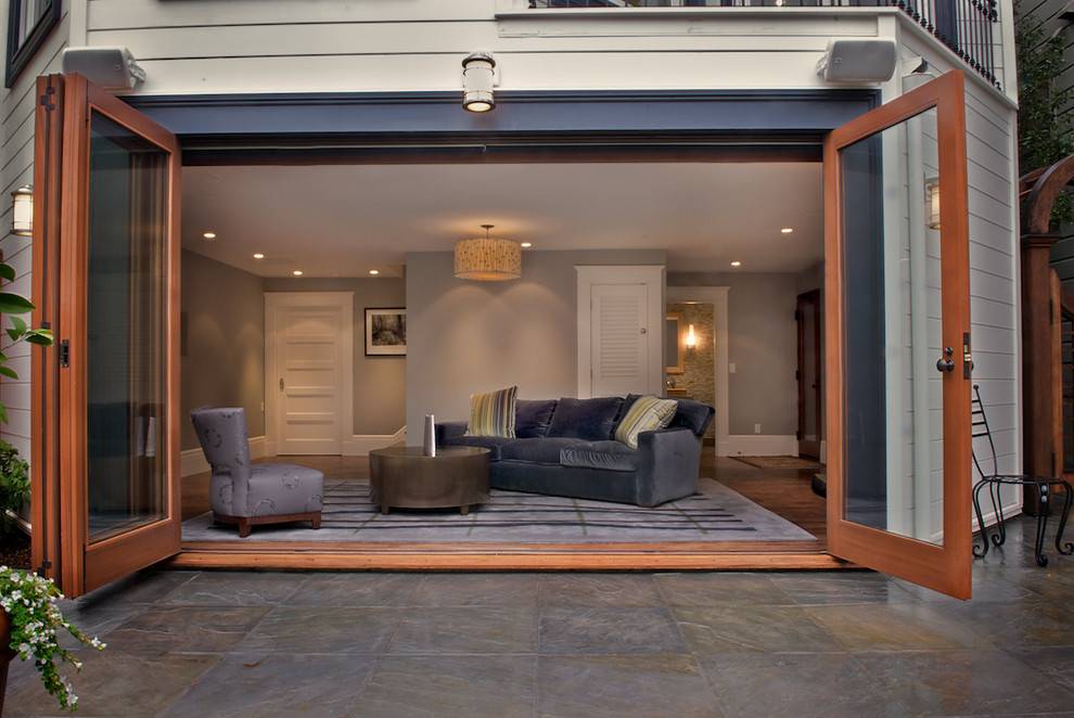 При переделке гаража в жилую зону всегда возникает вопрос о том, что делать с открыванием ворот. Ведь гаражные двери имеют большое влияние не только на функциональность пространства, но и на его внешний вид. Хорошим решением является сохранение ворот, как это показано на следующем фото.