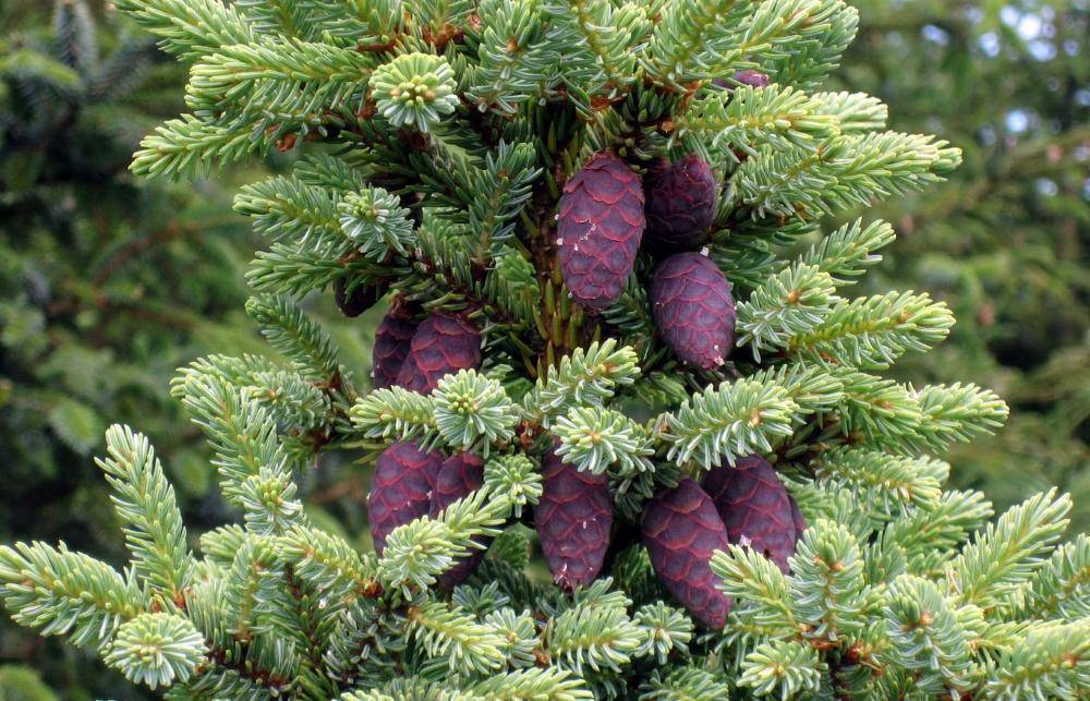 Для нашей страны этот сорт ели является экзотикой — он растет в высокогорных китайских лесах. Название получено из-за специфического цвета шишечек, появляющихся на концах веток (обычно, они светло-зеленые). Дерево отличается неприхотливостью, хорошо растет и на свету, и в тени. Кроме того, пурпурная ель вполне приспособлена к морозам и другим климатическим проявлениям. Может достигать высоты до 25 м. Имеет густую, четко конусообразную крону.